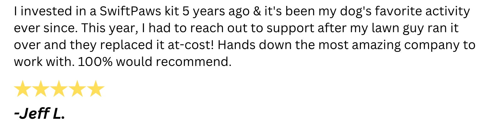We have the perfect kit for every backyard. SwiftPaws kits all provide mental and physichal enrichment for your pup, but have different course lengths and speeds. This means every pup, regardless of skill level, has a SwiftPaws kit made for them!